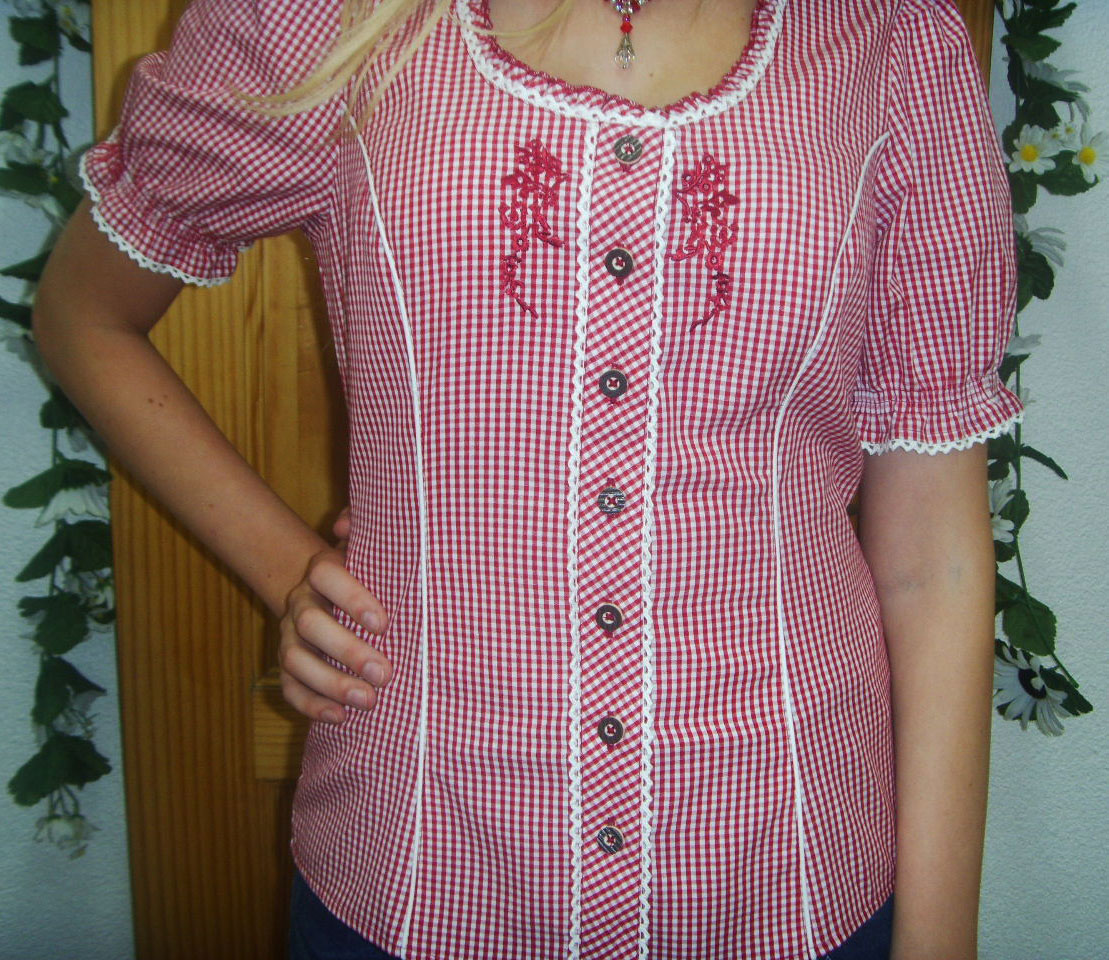 Diese junge und klassische rot weiße Trachtenbluse, sollte in keinem Kleiderschrank fehlen. Trotz taillierter Schnittführung, hat die Bluse eine super Passform. Die Bluse hat am Ausschnitt eine kleine Rüsche. Neben der Knopfleiste und am Arm ist eine kleine Spitzenborte. Die Knöpfe an der Bluse sind aus Hirschhornoptik. Im Rücken wird die Bluse geschnürt.Farblich abgesetzt sind die Wiener Nähte. Im vorderen oberen Brustbereich ist noch eine kleine aufwendige Stickerzeizier.
