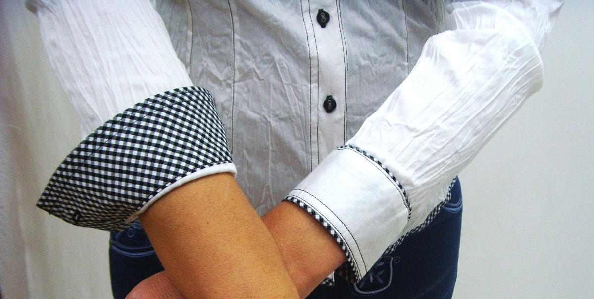 Diese weiße modische Crash Bluse hat eine taillierte Schnittführung mit farblich abgesetzen Nähten. Am Arm und im Kragen ist eine schwarz weiß karierte Kontrastgestaltung. Diese wiederholt sich auch auf der Brusttasche. Diverse Stickereien im Brustbereich und am Rücken machen die Bluse zu etwas besonderem. An den Taschen befinden sich kleine glänzende Schmuckanhänger. Eine tolle Bluse mit hohem Tragekomfort.