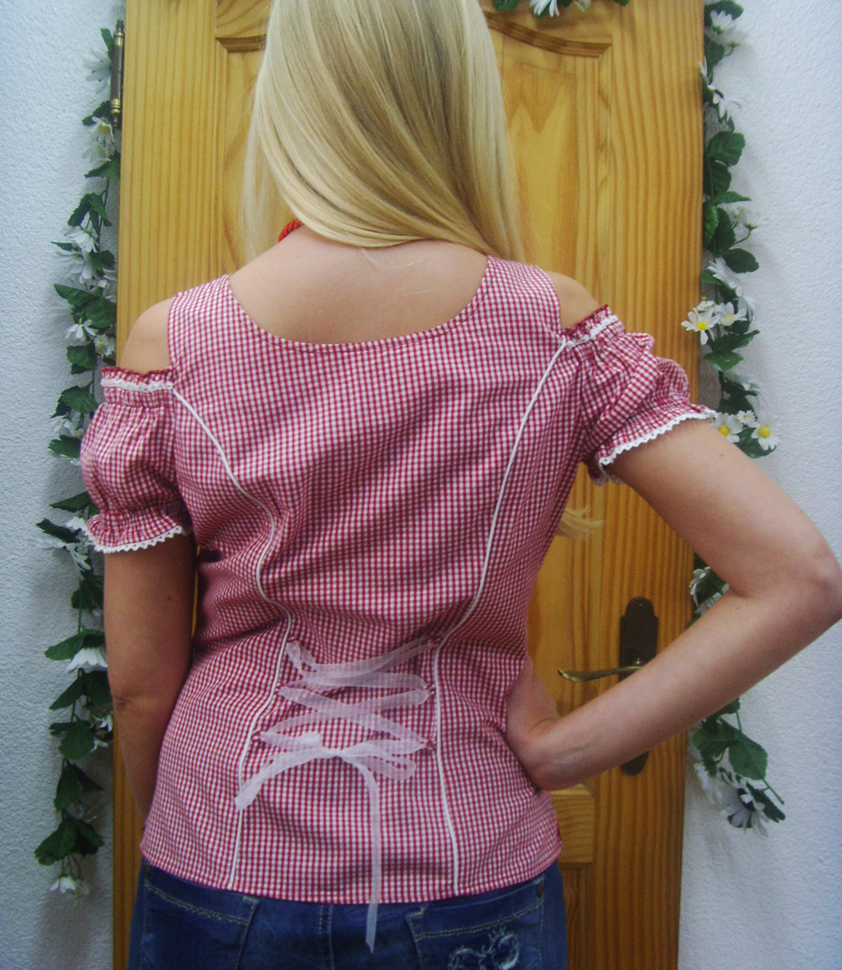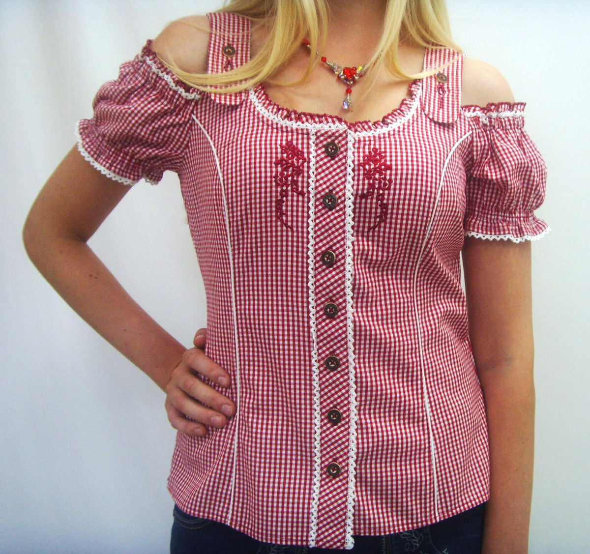Auf jeder Party, haben Sie mit dieser Bluse ihren persönlichen Auftritt. Nicht nur zur Lederhose, sondern auch zur Jeans können Sie diese leicht antaillierte Carmenbluse tragen. Die karierte Bluse im Minikaro kann man am Träger verstellen und Sie ist im Rückenteil zum schnüren. Dadurch bekommen Sie immer eine schöne Taille. Im Ausschnitt und am Arm, sowie an der Knopfkante verläuft eine kleine dezente weiße Spitze. Die Bluse hat schöne Trachtenknöpfe in Hirschhornoptik und eine tolle Stickereizier.