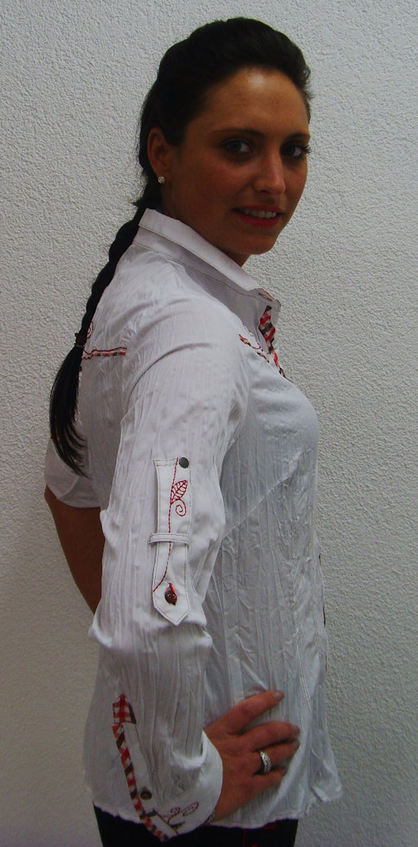 Trendstarke modische Trachtenbluse im Crashdesign. Die Trachtenbluse hat liebevolle Stickereien auf der Vorderseite und am Arm, sowie im Rücken. Diese modische Bluse könnte ihre Lieblingsbluse werden. Die farbliche Kontrastborde in rot an der Knopfleiste ist ein Hingucker. Ebenso die modischen Knöpfe. Im Krageninneren ist ebenfalls die Kontrastgestaltung wie an der Knopfleiste. Die Arme sind zum aufkrempeln. Die Trachtenbluse ist leicht talliert und fällt daher etwas kleiner aus. Das tolle ist, das diese Bluse bügelfrei ist. - Super