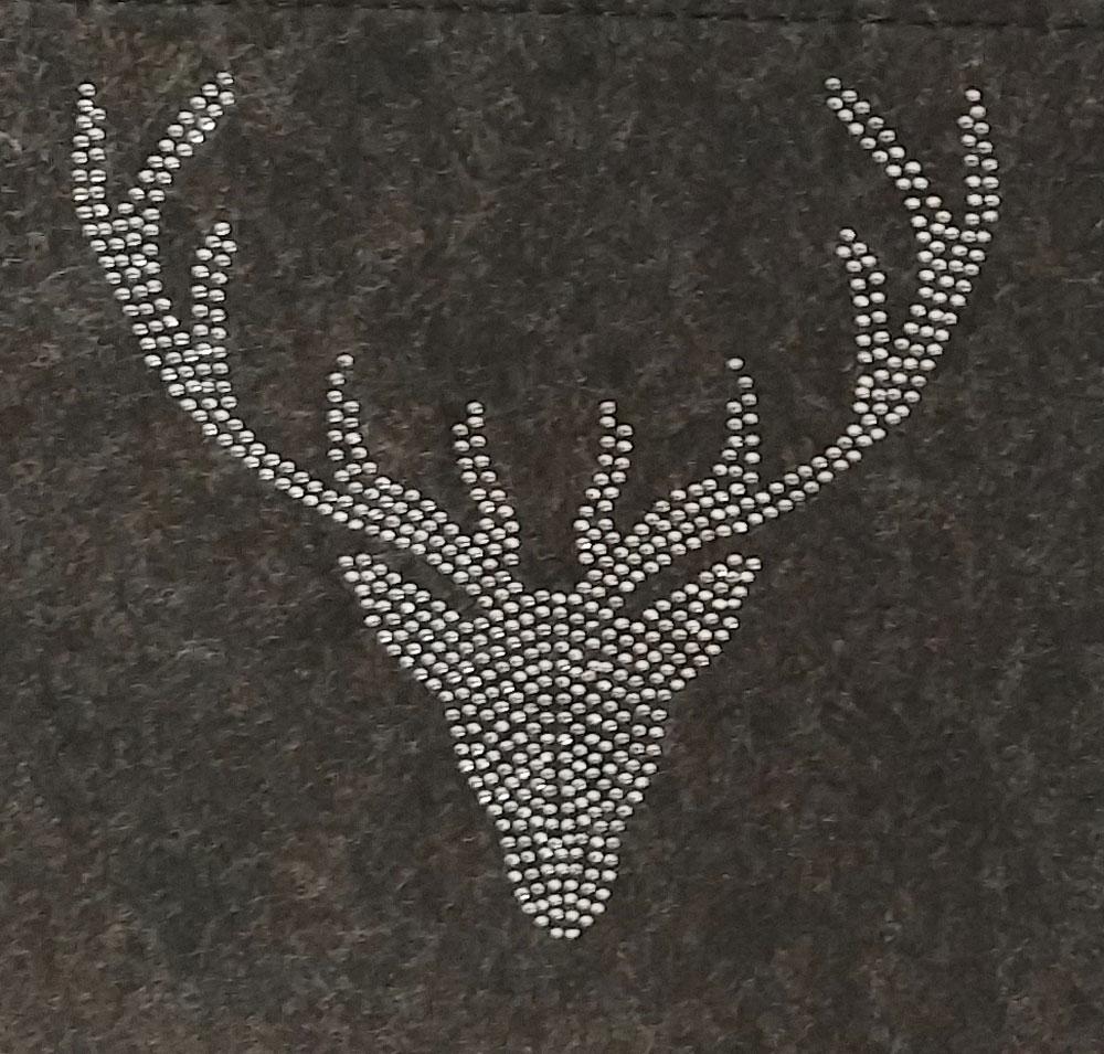Schöne, praktische, dunkelgraue Filztasche mit einem Geweih aus Glitzersteinen. Die Tasche ist ideal zum Einkaufen, macht sich aber auch gut als Badetasche oder zur Aufbewahrung von Zeitungen oder Handarbeiten. Die Tasche hat eine eckige Form und stabile Henkel in hellgrau. Die Henkeltasche hat eine Größe von 43x24x60cm