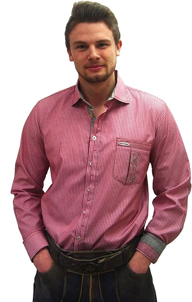 Trachtenhemd mit Slim Line Passform. Es hat Doppelstreifen in rot und einen farblichen Kontrast in khaki an den Manschetten, Brusttasche sowie im Krageninneren und auch außen. Eine Stickerei verziert die Brusttasche. Das Hemd hat Perlmuttoptikknöpfe. Diese sind halb verdeckt von der Knopfleiste. Die Innenseite der Knopfleiste ist auch farblich in khaki abgesetzt.