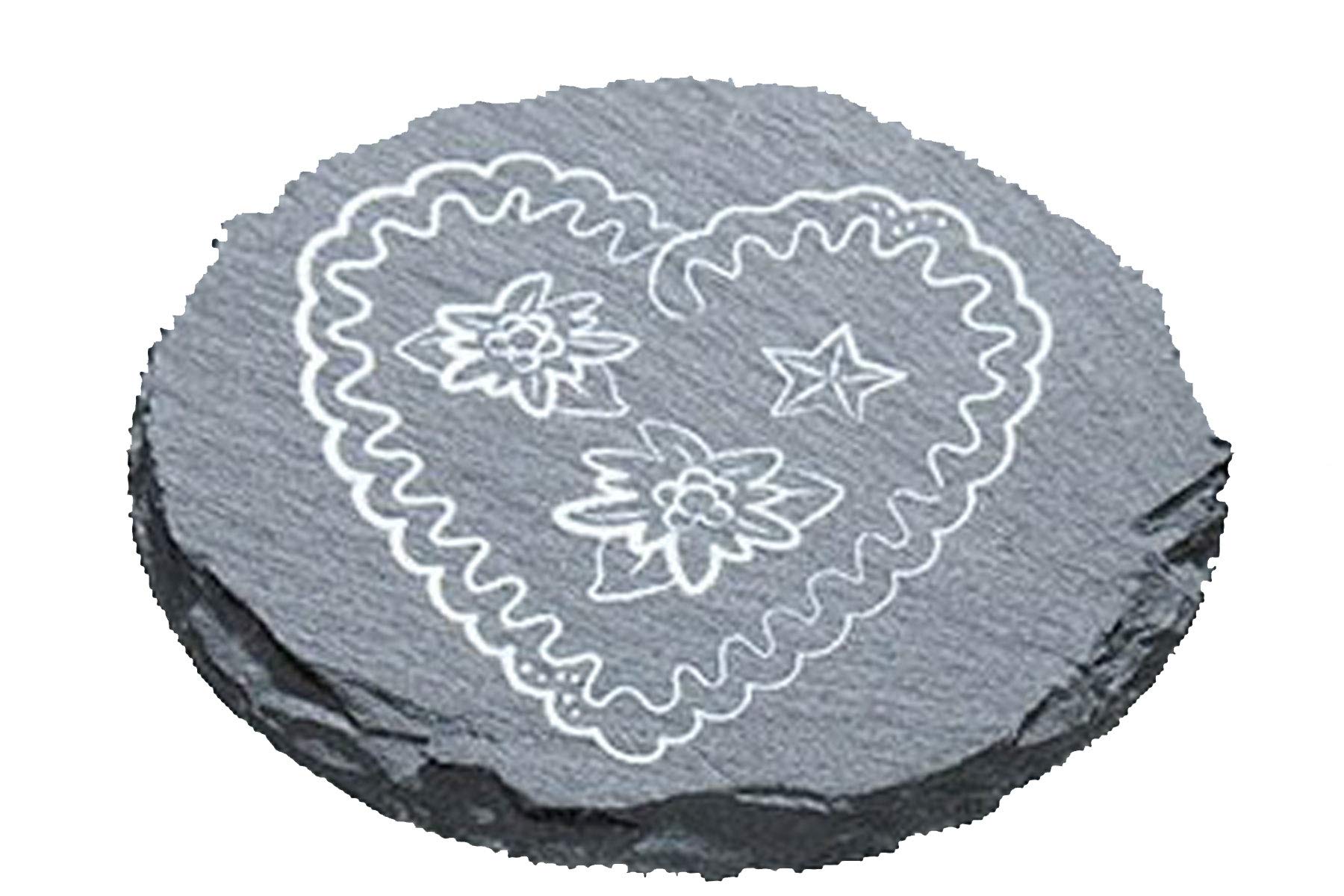 Diese Schiefer-Untersetzer mit Herz und Edelweiß Gravur verbinden rustikalen Alpen-Chic mit praktischem Nutzen. Sie schützen Oberflächen vor unschönen Rändern und setzen gleichzeitig einen traditionellen Akzent. Ein Must Have sind diese ausgefallenen Untersetzer aus Schiefer. Trendig und auch ein schönes Geschenk für Freunde.