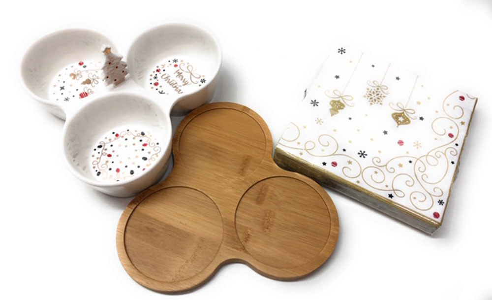 Dippschalen Sterne Christmas aus Porzellan mit Bambustablett 3 Stück 20,5 x 17 cm
