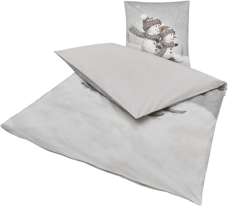 Bettwäsche FrostyVerleihen Sie Ihrem Schlafzimmer mit der romantischen Bettwäsche Frosty eine Note von Gemütlichkeit. Diese hochwertige Bettwäsche zeichnet sich durch ein ansprechendes Schneemannmotiv aus, das eine beruhigende Atmosphäre schafft und sich ideal für einen erholsamen Schlaf eignet. Passend für jedes Schlafzimmer, bietet sie eine perfekte Kombination aus Stil und Komfort.Die Renforce-Bettwäsche ist grau mit Schneemannmotiv und besteht aus 100% Baumwolle.