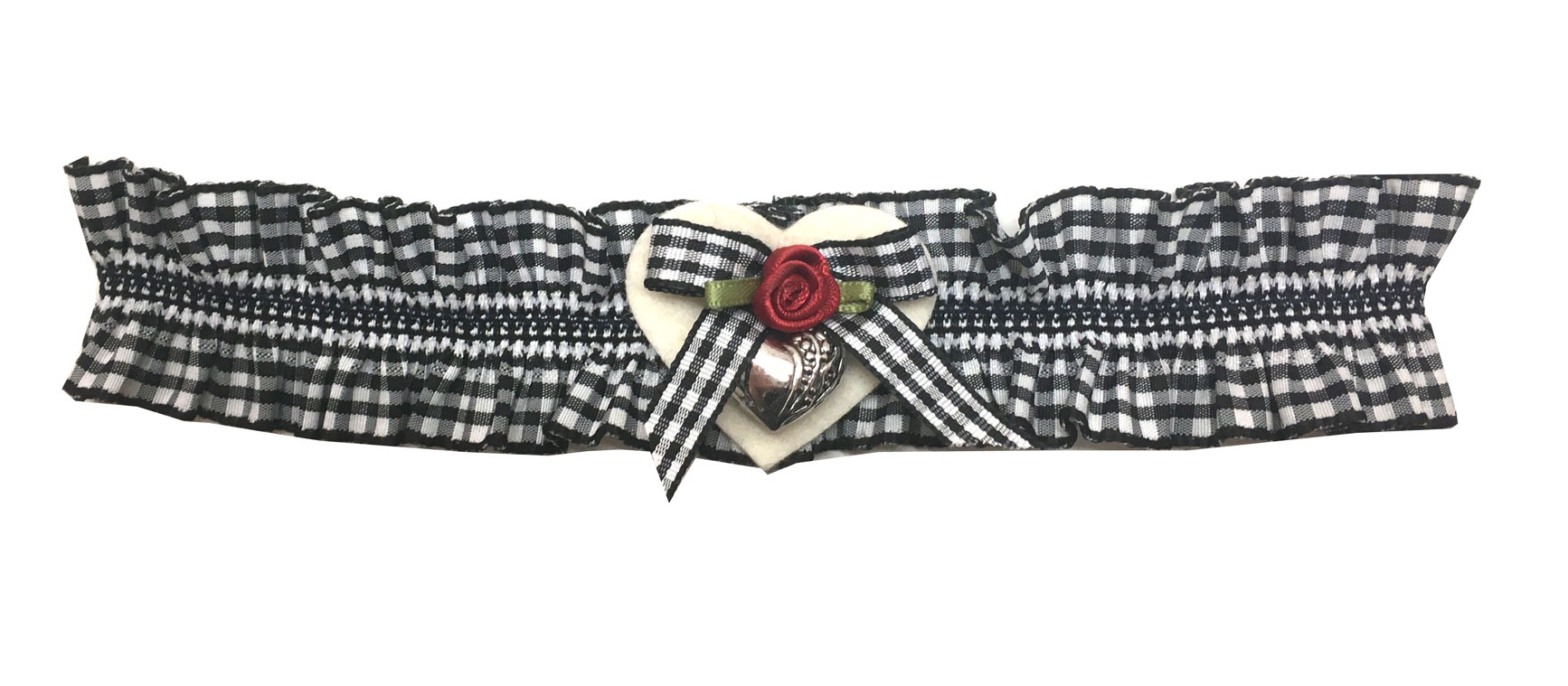 Wenn Sie sich ein Dirndl gekauft haben, gehört dazu natürlich ein Strumpfband. Das ist in der neuen Saison ein "Must Have". Das niedliche Strumpfband ist auf einem Filzherz mit einer Rose und einem Metallherz und einer karierten Schleife.